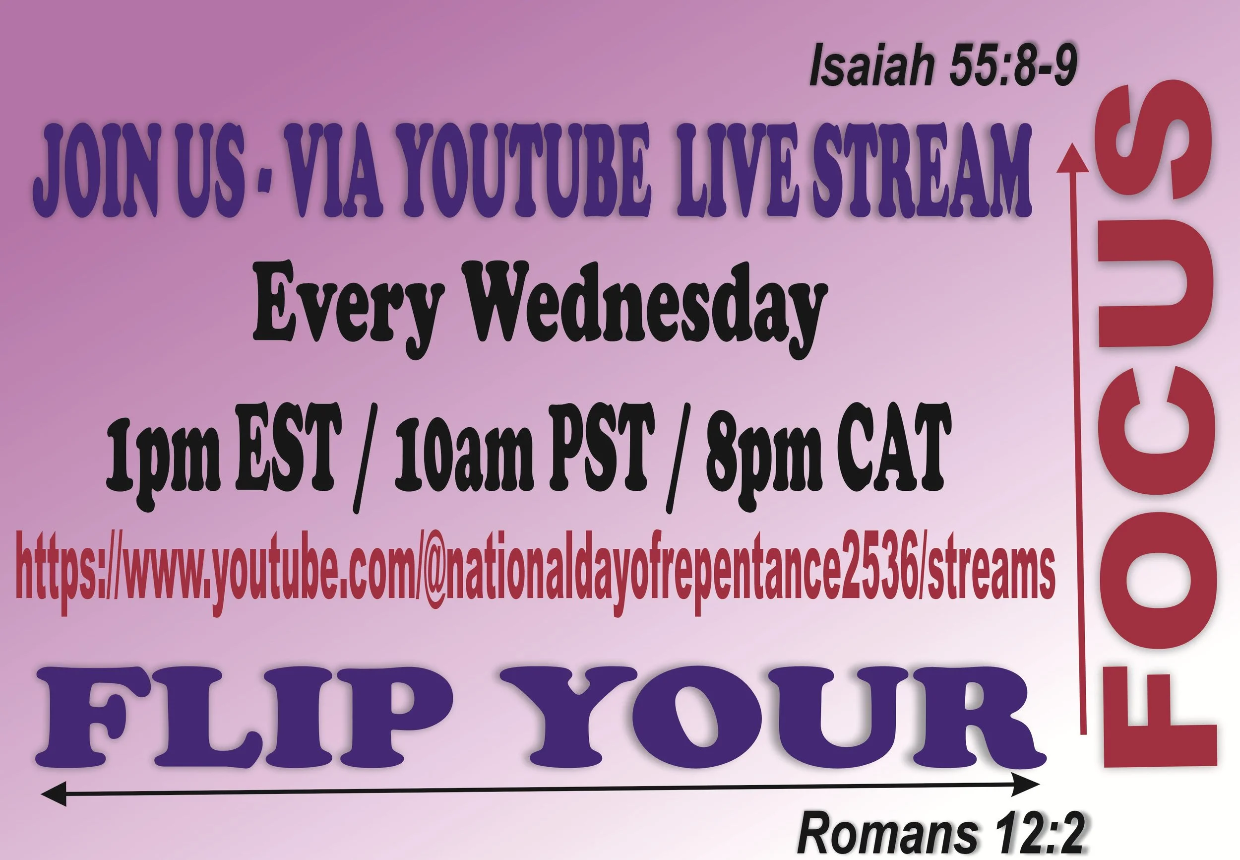 Join us again every week - on Wednesday morning 10:am Pacific Time - via YouTube Livestream, as we FLIP our FOCUS from this earthly realm back to God - in a time of Personal Repentance, Removing and Cleansing as His Bride from 1 Sin-Stronghold at a time - Working on Perfecting Holiness in the Fear of God.