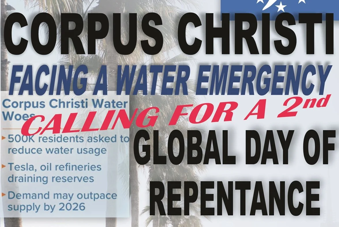 In Beeville our neighbors face, not many days from now, no water. Following God's Solution, a 2nd Day has been declared on February 18, 2026 @ 1pm EST / 9am PST / 12noon CST / 8pm CAT for all those "called by My Name" in Corpus Christi to take time, privately or in any service, to humble themselves, and pray, and seek His face, and turn from their sins. In all 800+ times earlier* God kept His Word on such days of "fasting, humiliation and prayer." His blessings always followed.